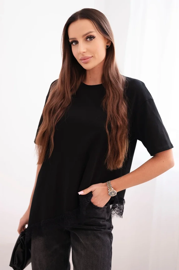 To jest bluzka uszyta z miękkiej, przewiewnej bawełny, taka, w której od razu czujesz się swobodnie. Na pierwszy rzut oka wygląda jak prosty t-shirt, ale asymetryczny dół wykończony koronką zmienia wszystko i dodaje jej kobiecego charakteru.