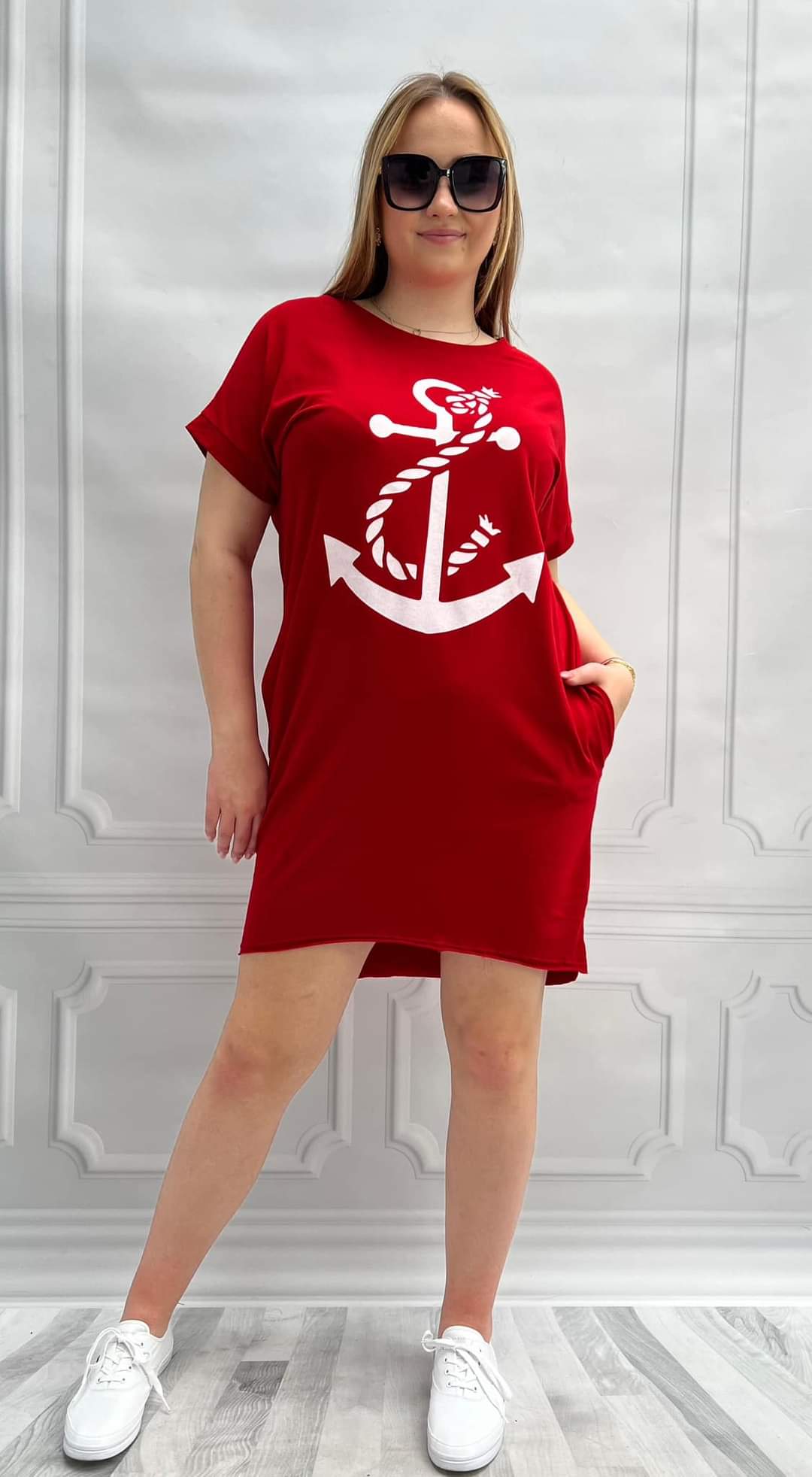 Bawełniana sukienka z nadrukiem kotwica. Krój tuba, a po bokach kieszenie.
