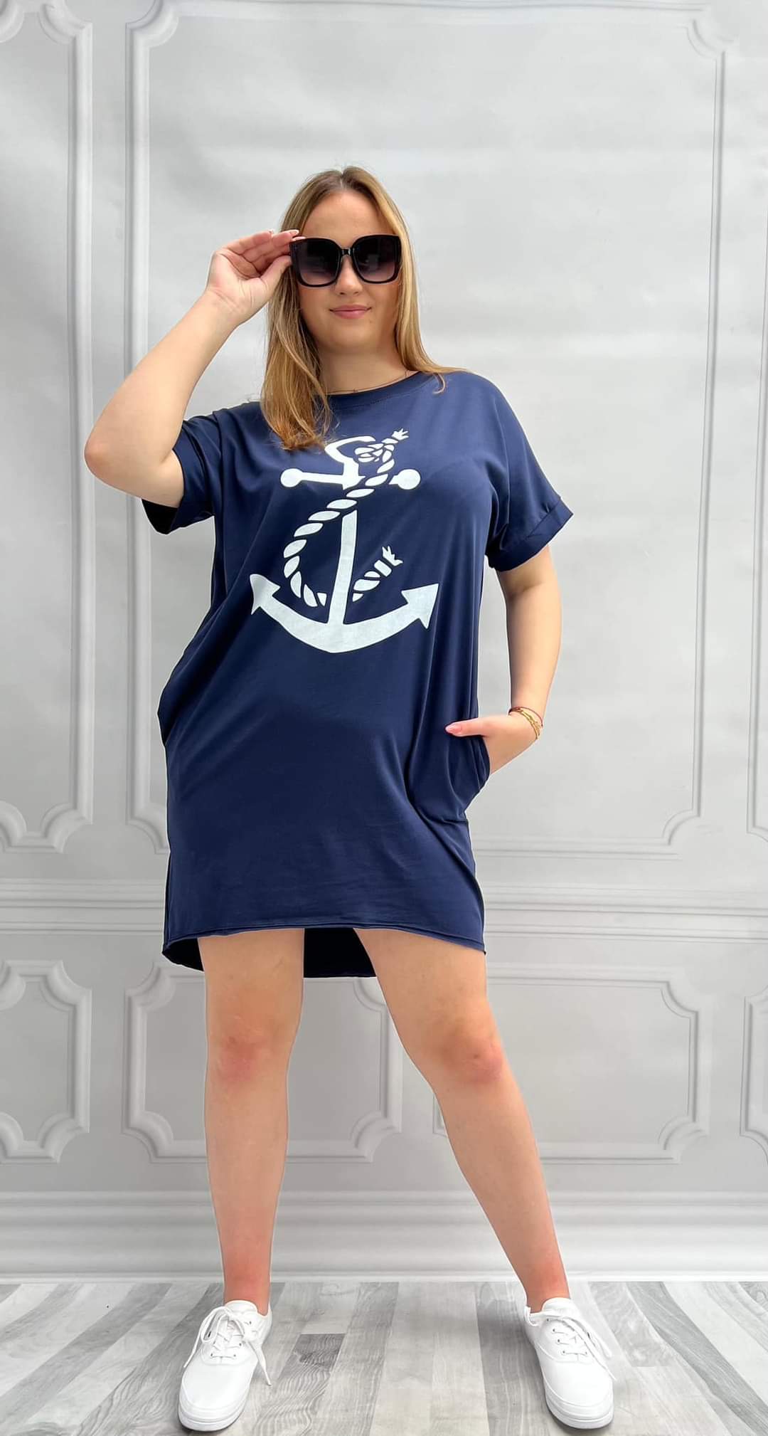 Bawełniana sukienka z nadrukiem kotwica. Krój tuba, a po bokach kieszenie.