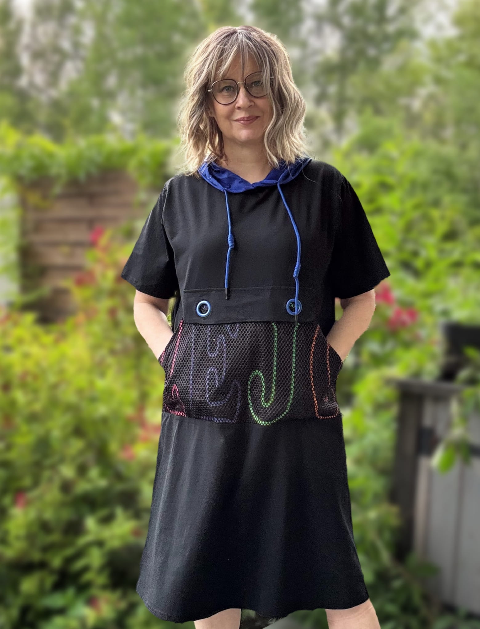 Bo Hultajka nie lubi nudy – ma napis, który ciągnie się przez całą sukienkę. Ale spokojnie – Ty nadal jesteś na pierwszym planie