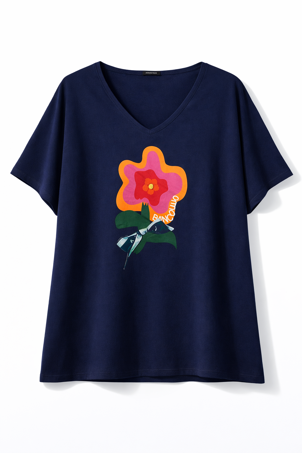 Kolorowy, radosny, z charakterem – ożywia stylizację i sprawia, że bluzka od razu przyciąga spojrzenia.