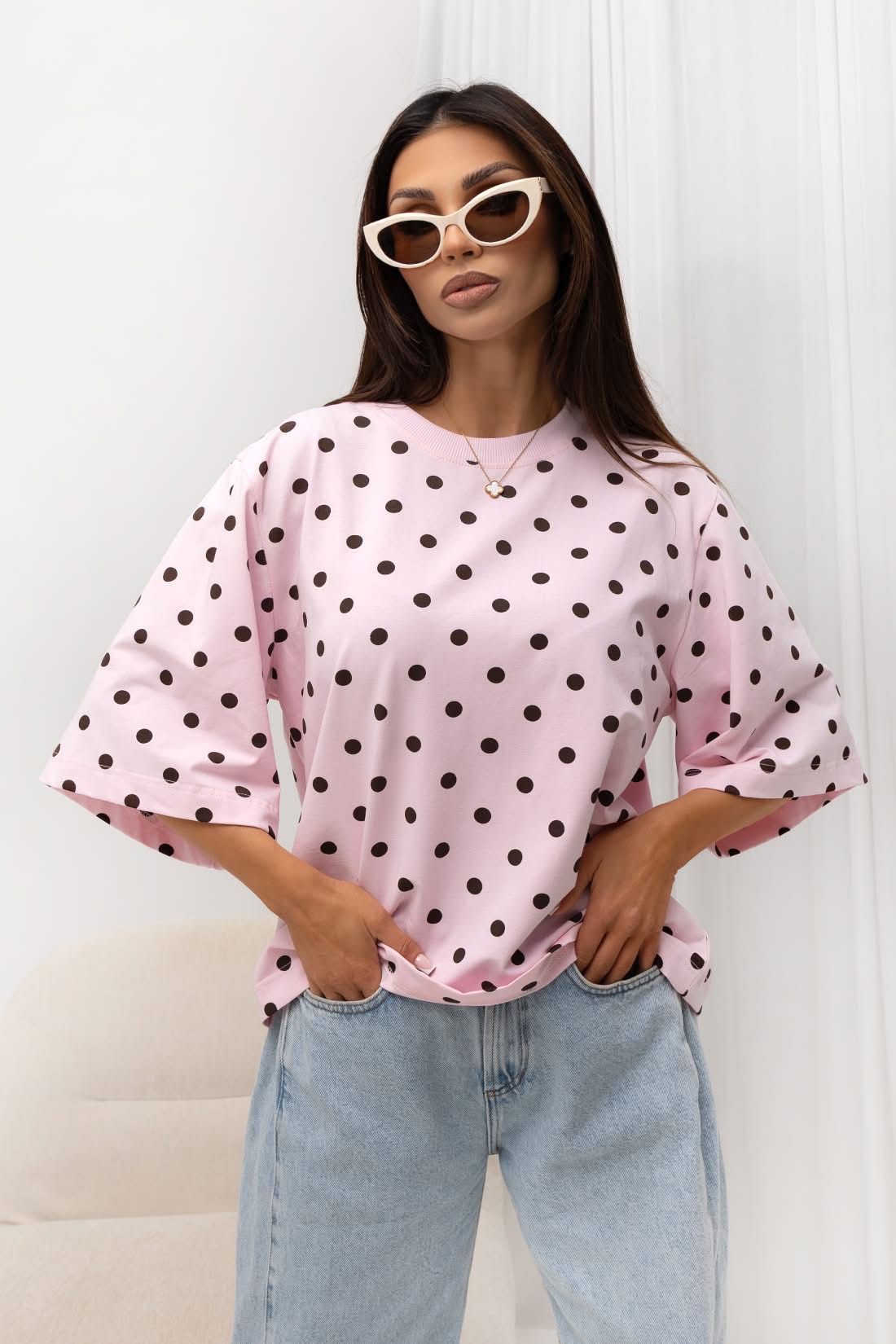 Bawełniany t shirt oversize KROPKI różowy