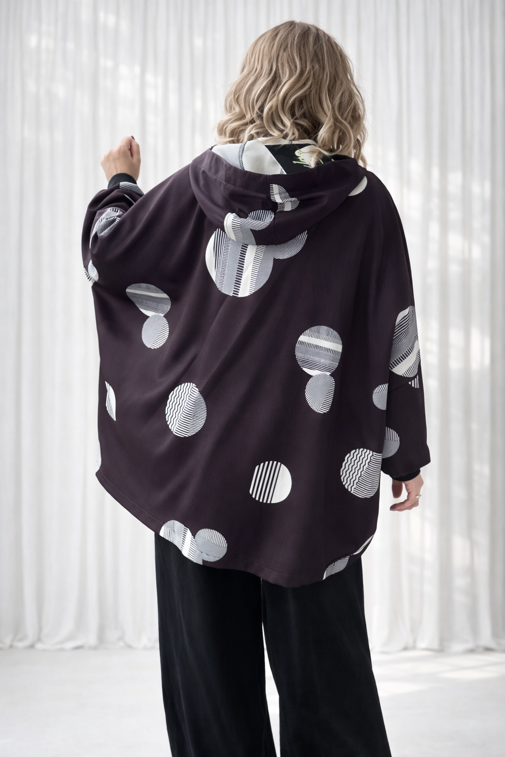 Luźna, opadająca linia ramion i rękawy zakończone ściągaczem – wszystko układa się miękko i swobodnie.