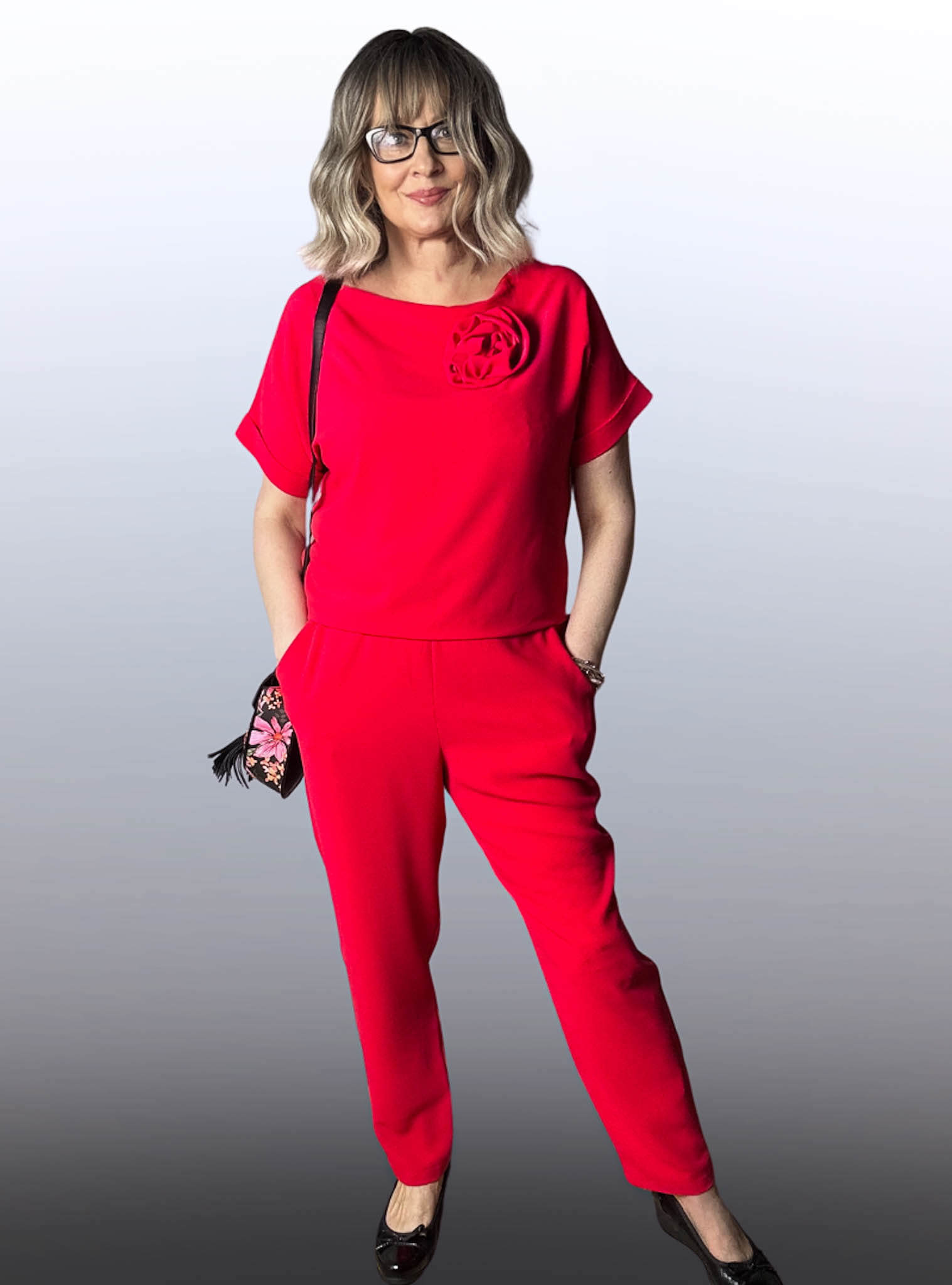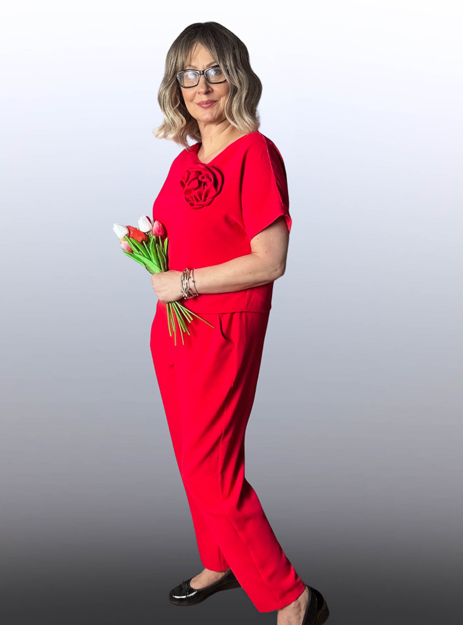 Z przodu – róża, niby detal, a robi całą robotę. Taki drobiazg, który sprawia, że to nie jest „po prostu kombinezon”.