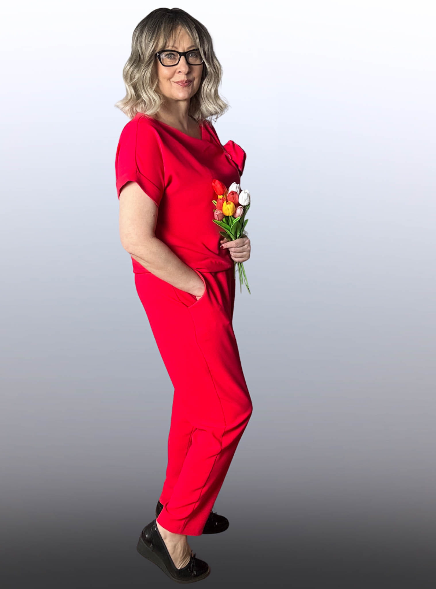 Ten kombinezon pięknie wyszczupla sylwetkę.