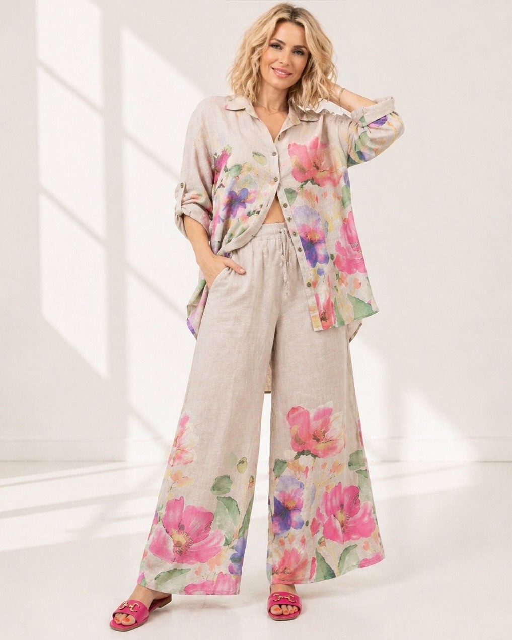 Koszula + spodnie. Razem wyglądają spójnie i bardzo stylowo, ale możesz je też rozbijać i tworzyć różne stylizacje – jak lubisz. Możesz założyć top pod spód i koszulę nosić jako narzutkę