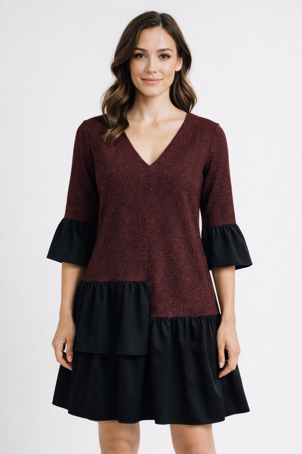 Rubinella to elegancka sukienka z błyszczącą, elastyczną górą, która dodaje jej świątecznego charakteru i jednocześnie jest bardzo wygodna.