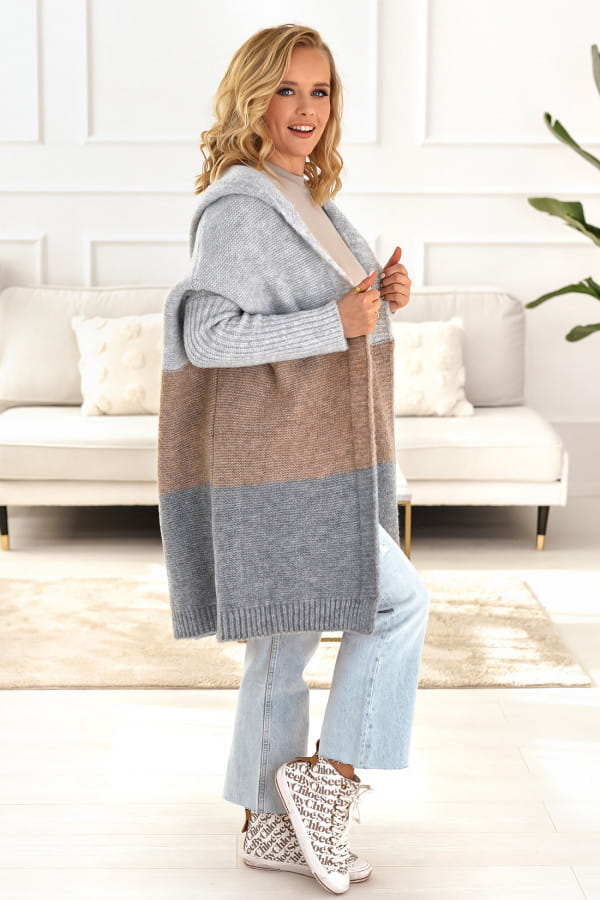 Oversizowy kardigan sweter z wełną TRIO szary/latte