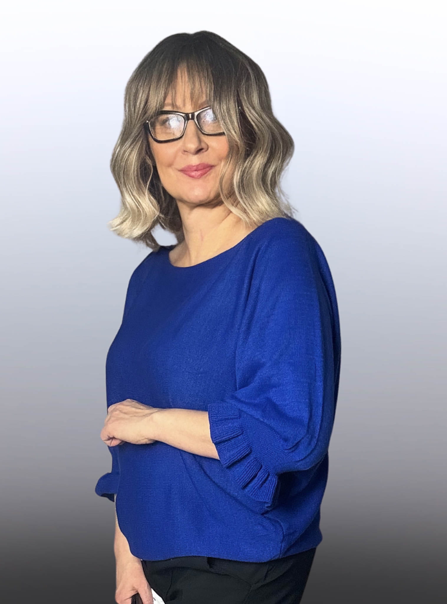 Jest luźny, swobodny, nie opina, tylko pięknie układa się na sylwetce – czyli jak coś trzeba zakryć, to zakryje, ale nadal wyglądasz stylowo i lekko. A te falbanki na rękawach? One robią całą robotę! Dodają dziewczęcego uroku i sprawiają, że sweterek nie jest zwykły – jest wyjątkowy.