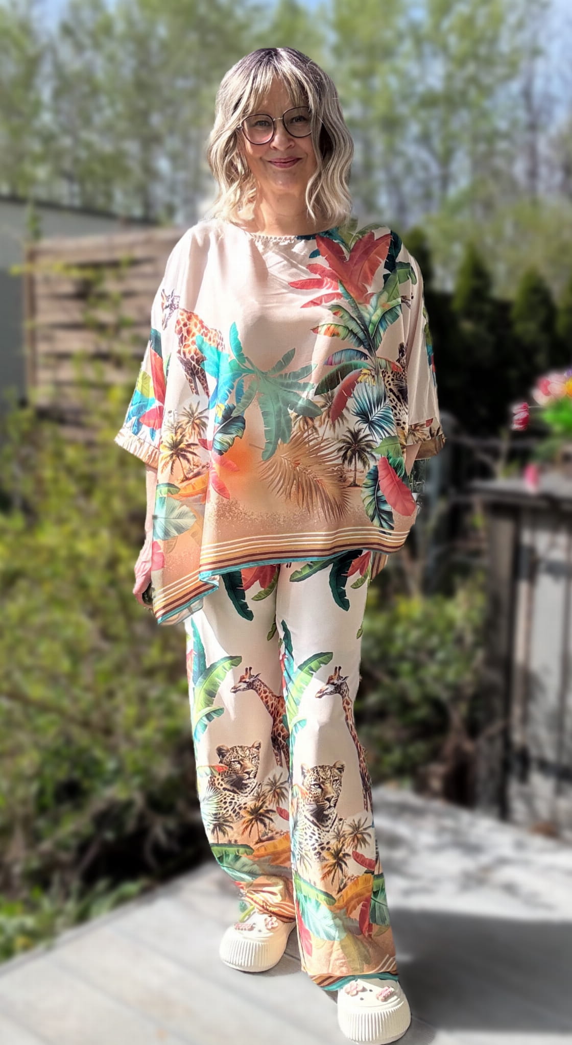 Uszyty z mięsistej, chłodnej w dotyku satyny – takiej, która nie klei się do ciała, tylko otula jak jedwabny wiatr. Góra luźna, szeroka, cudownie ukrywa wszystko, czego nie chcemy pokazywać – ale robi to z klasą. Dół? Szerokie, swobodne spodnie na wygodnej gumeczce – nie uciskają, tylko dopasowują się do sylwetki jakby znały Cię od lat.