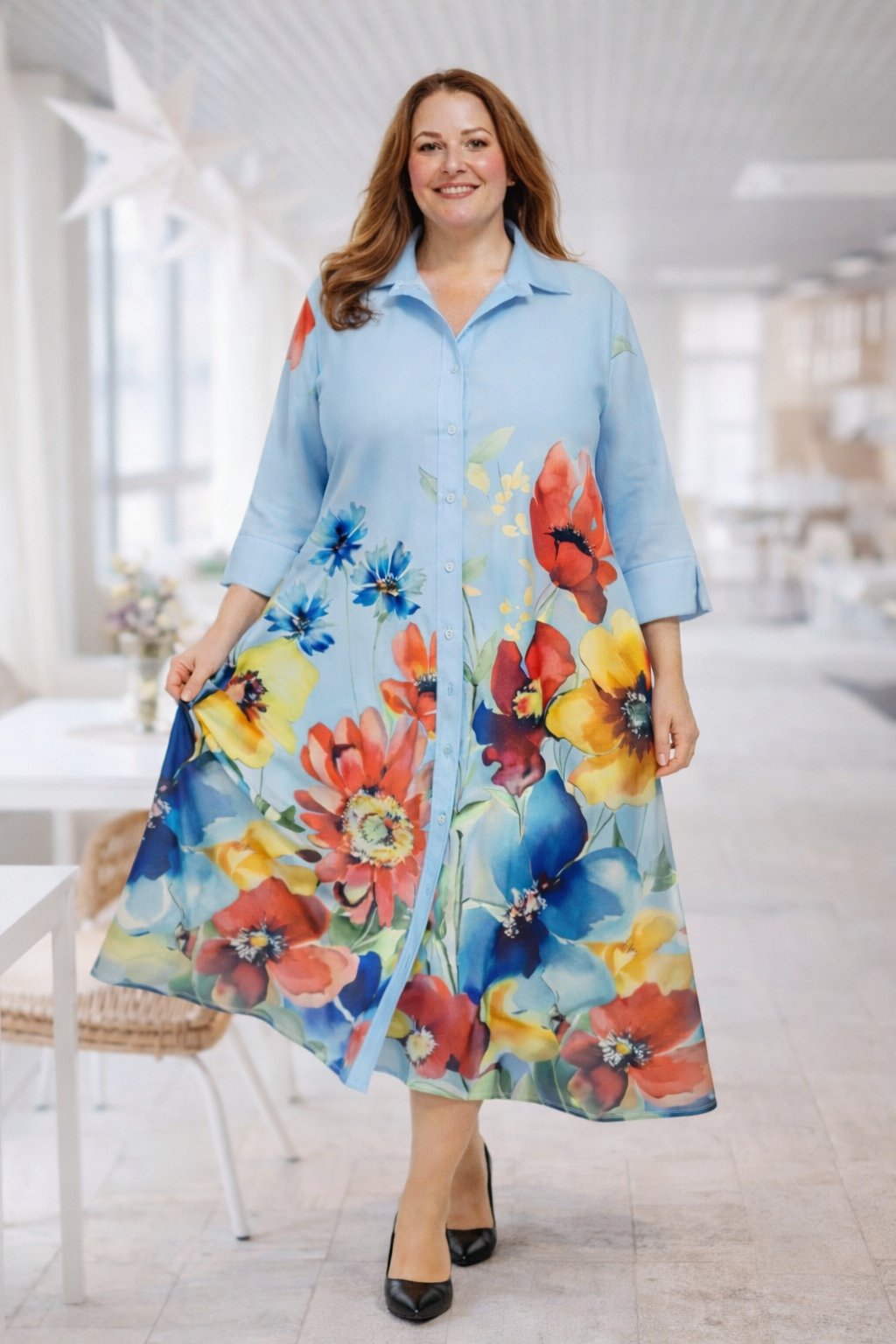 Wiskozowa sukienka plus size KWIATY błękitna PRE ORDER