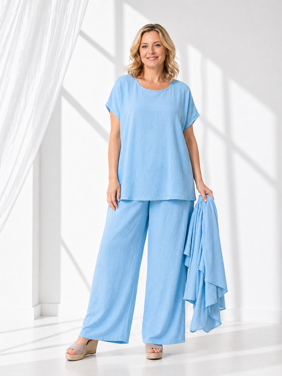 Składa się ze spodni, bluzki i asymetrycznej narzutki. Wszystko w jednym kolorze, z tego samego materiału – spójnie i z klasą.
