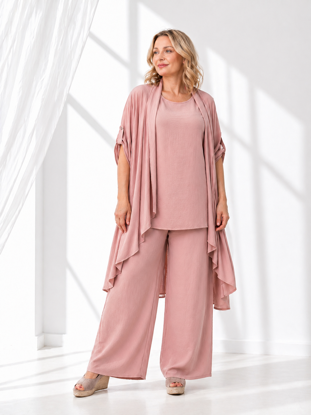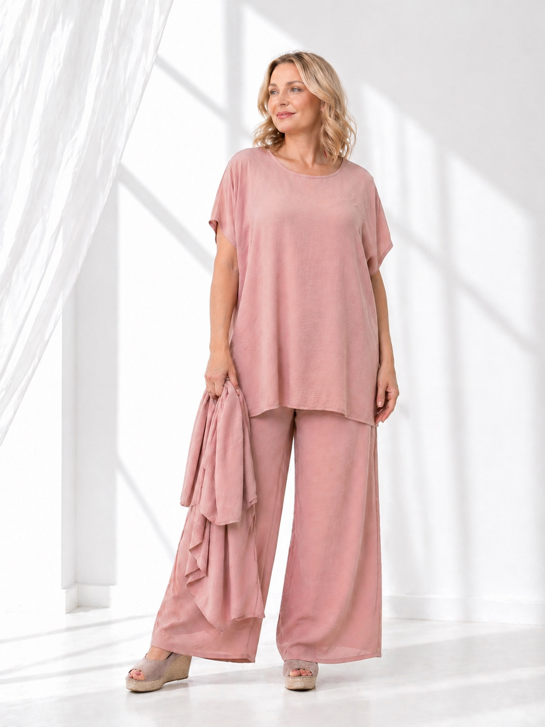 Składa się ze spodni, bluzki i asymetrycznej narzutki. Wszystko w jednym kolorze, z tego samego materiału – spójnie i z klasą.